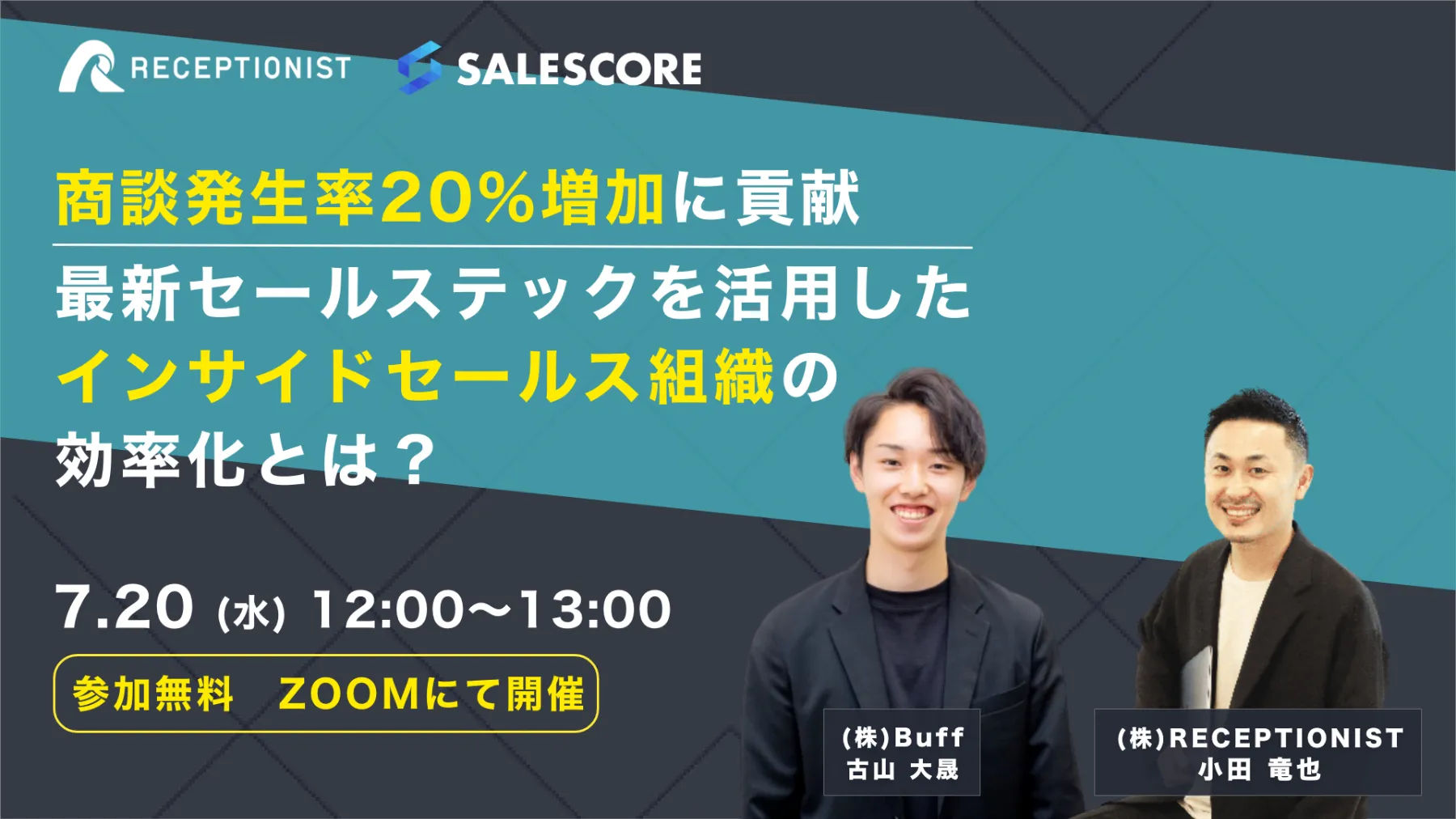 「インサイドセールスの生産性が向上しない、、」「ひたすら電話をかけるだけの組織になってしまっている、、」「人によって成果がバラバラ、、」 インサイドセールス組織においてそれぞれが各々のやり方でとりあえず電話をかけるような組織になってしまっている。そのような事象はございませんか? 本セミナーでは、セールステックサービスを運営しているBuff社・RECEPTIONIST社の2社がCRM、CTI、MAをはじめとした多種多様なセールステックを活用し、「商談発生率の20%増加」「商談設定工数を1/5にまで削減」などの成功事例を交えた、インサイドセールスの再現性を高める、生産性を向上する、成果を最大化する方法をお伝えいたします。こんな人にオススメ