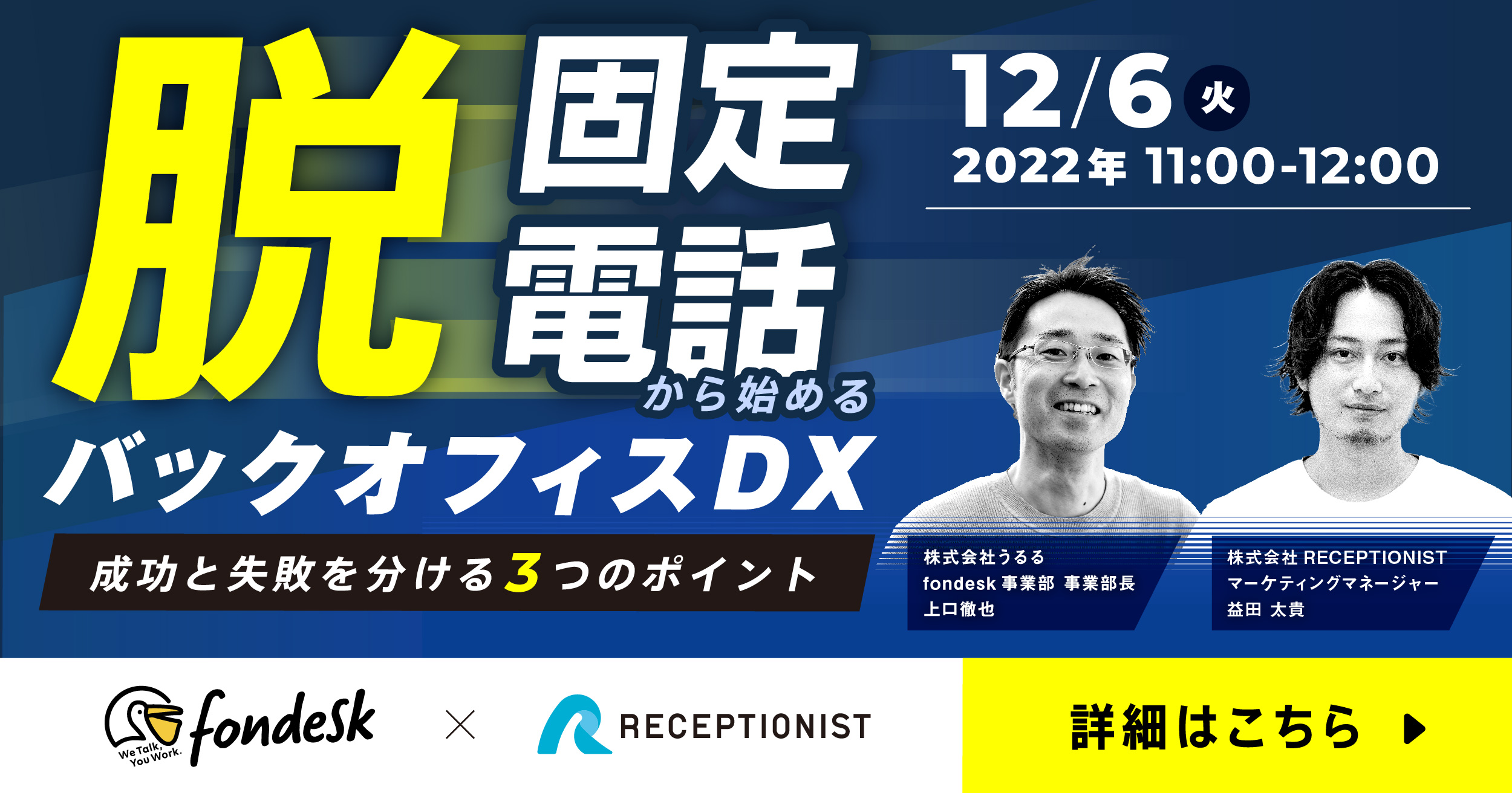 11:00-11:05:開会の挨拶 11:05-11:25:講演①株式会社RECEPTIONIST「ComingSoon」 11:25-11:40 講演②株式会社うるる「DXのスタートは身近な業務から 雑務を減らすのが成功の鍵」 11:40-11:55:質疑応答 11:55-12:00:閉会の挨拶 ※講演内容・スケジュールは都合により変更される場合がございます。セミナー概要