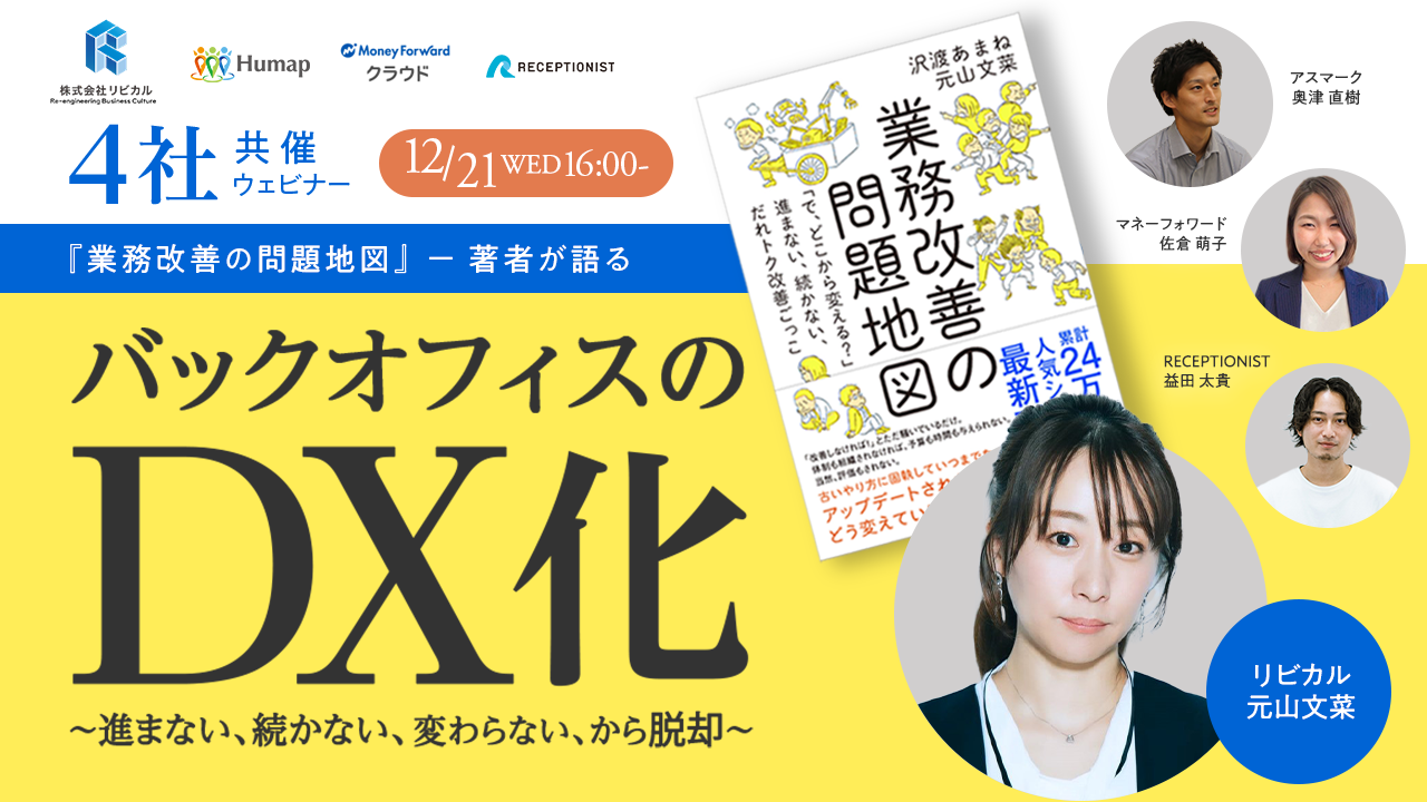 前回大変ご好評をいただき、100名以上にお申し込みいただいた大人気のDXセミナーを再公演いたします! ぜひこの機会を逃さぬよう、お早めにお申し込みくださいませ! 自社事業における大小の様々な課題を発見し、仕組みを見直すことで、効率の高い業務環境を生み出すことができる「業務改善活動」。働き方改革以降、現在では様々な企業が業務改善に特化した施策に取り組んでいます。 しかし企業がいざ「改善」を進めていく中で、想定通りに業務が改善されないケースは多く散見されます。その理由は様々であり、現場の実態や社員の声と乖離した取り組み内容であったり、業務上で顕在する課題の洗い出しの理解や認識が不十分であるなど、適正な方法で現場に即したソリューションが描けていないパターンがほとんどです。 では、自社に適正化する「業務改善」の最適解はどのように掴めばよいのでしょうか。 今回は書籍『業務改善の問題地図 「で、どこから変える?」』を著書に持つ、 システム変革のパートナー「株式会社リビカル」代表の元山文菜氏をメインスピーカーに迎え、業務改善×DX化をテーマに4社共催形式でセミナーを開催いたします。 この機会に、自社の業務改善へ直結する最新のソリューション方法についてご理解を深めていただければ幸いです。プログラム
