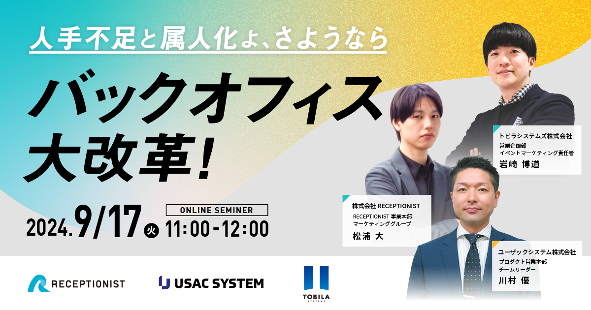 現在、人手不足による倒産が過去最多を更新し続けていることをご存知でしょうか? 全業種で正社員の人手不足が51%に達し、半数以上の企業が深刻な状況にあります。 さらに、団塊世代の後期高齢化で、労働力不足が一層進むと予測されています。 このように、人手不足は【企業経営の大きな課題】であり、早急な対応が必要です。 また、人手不足の影響により、各部署で属人化も進んでいます。 人手不足や属人化を解消するには採用が理想ですが、 短期的な解決は難しいため、現メンバーで業務を回す必要があります。 これらの問題を解決するには、 「外部リソースの活用」「システムの導入」など、従来の方法を大きく変えて業務負担を軽減し、 現メンバーで十分に対応できる体制を整えることが非常に重要です。 しかし、バックオフィス部門では、 「紙」「固定電話」「手作業」といった従来の方法を採用しているケースが多く、 新しい方法への移行が進んでいません。 こういった従来の方法を見直し、 効率的な方法に変えることで業務が効率化され、 従業員の満足度向上や働きやすい環境が実現し“人手不足や属人化の解消”につながります。 そこで本セミナーでは、 バックオフィスDXを得意とする3社が、 人手不足と属人化をテーマに、解決のヒントや具体的な事例について解説いたします。 (1)年間約300万人が利用するクラウド受付システム「RECEPTIONIST」を提供する株式会社RECEPTIONIST (2)売上増に対応可能な業務体制の構築を支援する「Robo派遣」を提供するユーザックシステム株式会社 (3)1500万人が利用する“迷惑電話フィルタ”搭載のクラウド電話「トビラフォンCloud」を提供するトビラシステムズ株式会社こんな人におすすめ