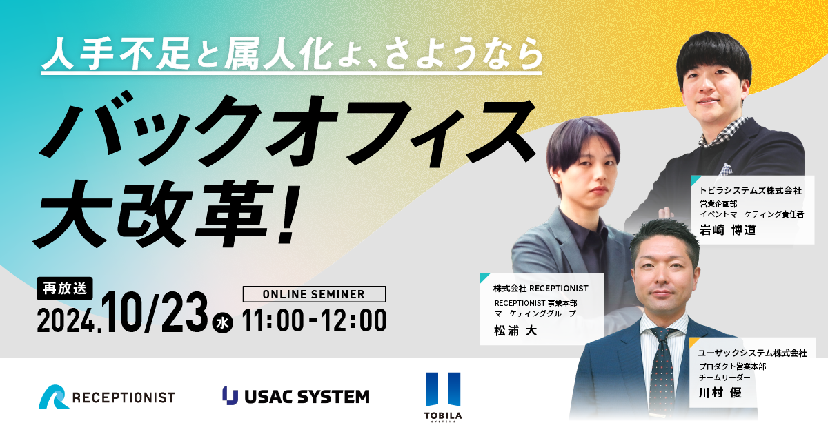 現在、人手不足による倒産が過去最多を更新し続けていることをご存知でしょうか? 全業種で正社員の人手不足が51%に達し、半数以上の企業が深刻な状況にあります。 さらに、団塊世代の後期高齢化で、労働力不足が一層進むと予測されています。 このように、人手不足は【企業経営の大きな課題】であり、早急な対応が必要です。 また、人手不足の影響により、各部署で属人化も進んでいます。 人手不足や属人化を解消するには採用が理想ですが、 短期的な解決は難しいため、現メンバーで業務を回す必要があります。 これらの問題を解決するには、 「外部リソースの活用」「システムの導入」など、従来の方法を大きく変えて業務負担を軽減し、 現メンバーで十分に対応できる体制を整えることが非常に重要です。 しかし、バックオフィス部門では、 「紙」「固定電話」「手作業」といった従来の方法を採用しているケースが多く、 新しい方法への移行が進んでいません。 こういった従来の方法を見直し、 効率的な方法に変えることで業務が効率化され、 従業員の満足度向上や働きやすい環境が実現し“人手不足や属人化の解消”につながります。 そこで本セミナーでは、 バックオフィスDXを得意とする3社が、 人手不足と属人化をテーマに、解決のヒントや具体的な事例について解説いたします。 (1)年間約300万人が利用するクラウド受付システム「RECEPTIONIST」を提供する株式会社RECEPTIONIST (2)売上増に対応可能な業務体制の構築を支援する「Robo派遣」を提供するユーザックシステム株式会社 (3)1500万人が利用する“迷惑電話フィルタ”搭載のクラウド電話「トビラフォンCloud」を提供するトビラシステムズ株式会社こんな人におすすめ